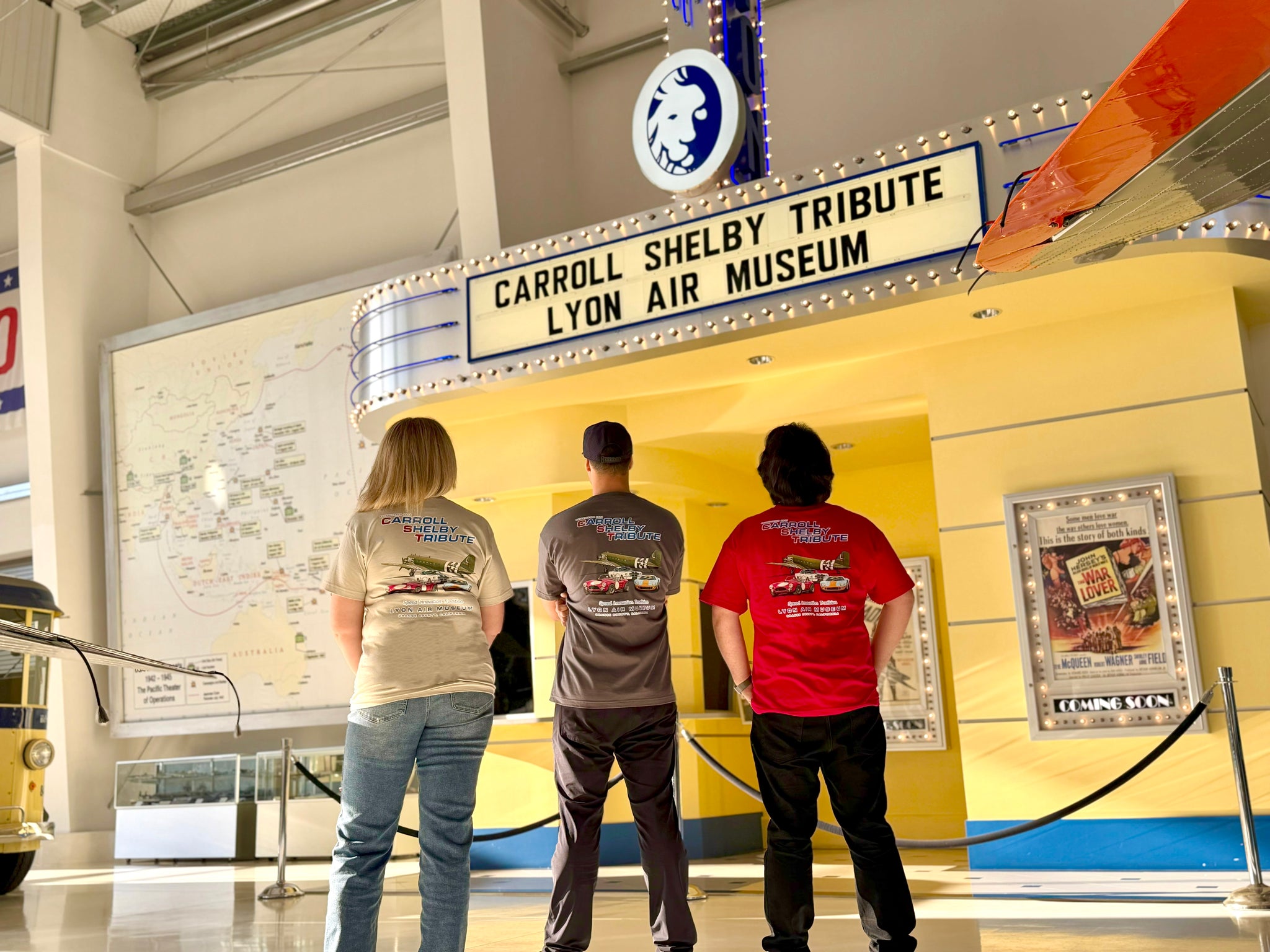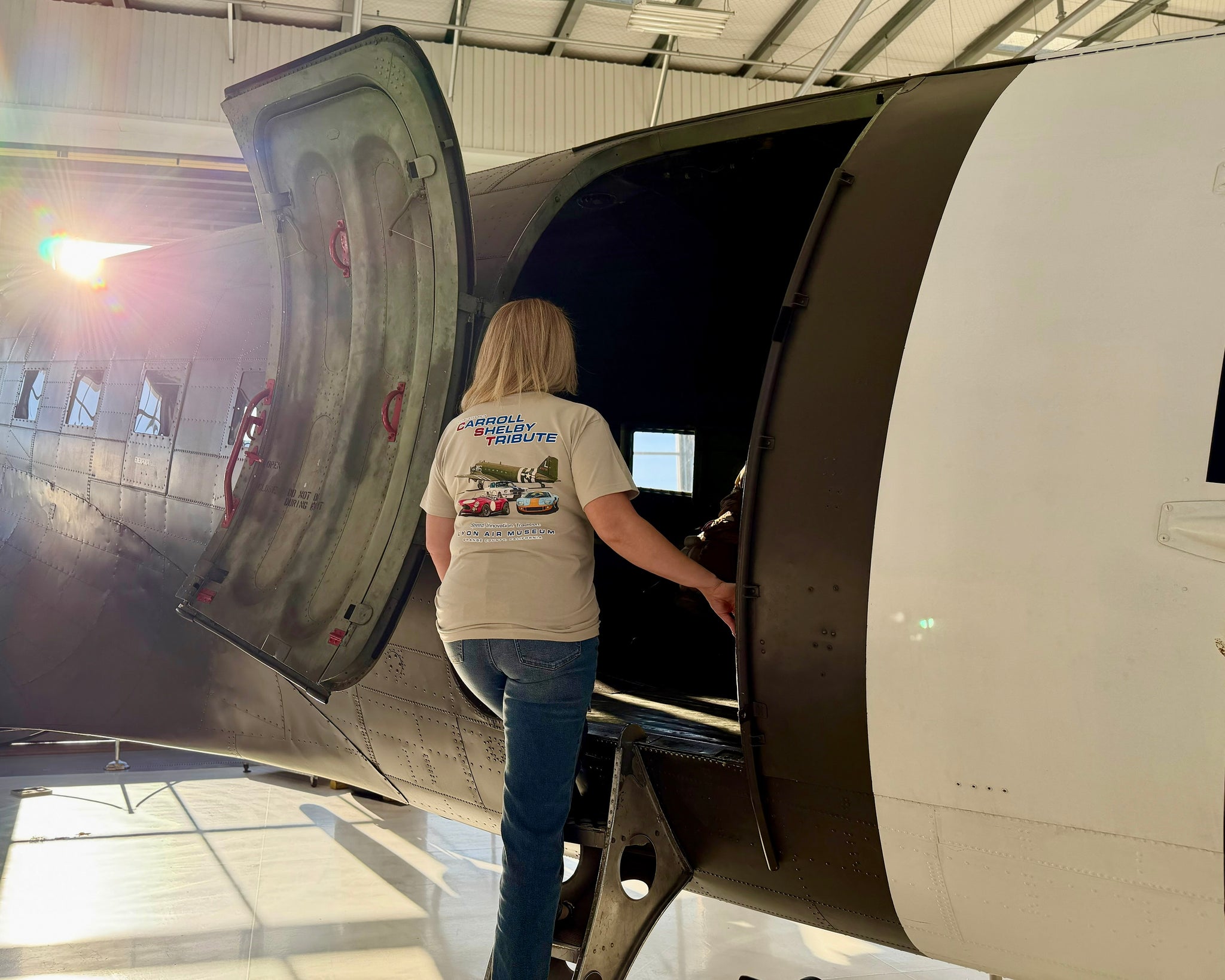 Our Shirt features the C-47 "Willa Dean" alongside iconic vehicles brought to life by the Automotive Legend Carroll Shelby, the Shelby Cobra, GT350, and GT40. Showcasing Speed, Innovation and Tradition.